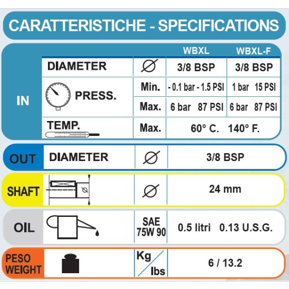 Típus: WBXL 1316Max. nyomás: 160 barMax. vízszállítás: 13 liter/percVillamos teljesítmény igény: 2,9 kWMotorfordulat: 1450 fordulat/percDugattyúk száma: 3 dbDugattyúk átmérője: 18 mmMagasnyomású fúvóka méret: 04